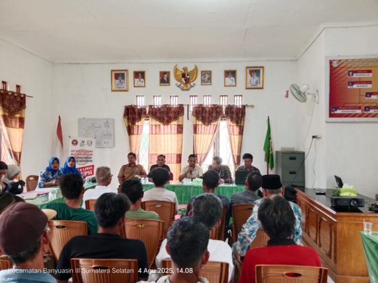 Banyuasin,- Pemerintah Desa Sri Bandung, Kecamatan Banyuasin III, Kabupaten Banyuasin, Sumatera Selatan, menggelar rapat pemetaan lahan untuk program cetak sawah, Senin (4/8/2025), bertempat di Kantor Desa Sri Bandung. Kegiatan ini menjadi bagian dari upaya mewujudkan ketahanan pangan melalui pemanfaatan lahan tidur yang selama ini terbengkalai.