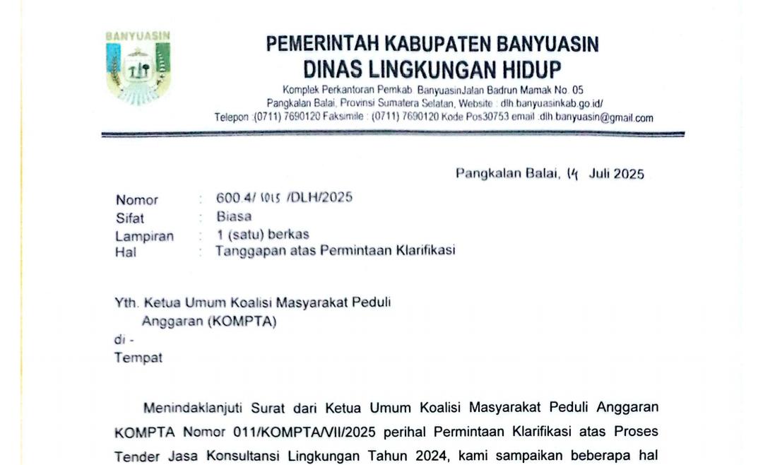Banyuasin, 25 Juli 2025 – Dinas Lingkungan Hidup (DLH) Kabupaten Banyuasin akhirnya memberikan tanggapan atas surat permintaan klarifikasi yang diajukan Koalisi Masyarakat Peduli Transparansi Anggaran (KOMPTA), terkait proses tender Jasa Konsultansi Lingkungan Tahun 2024. Namun, tanggapan tersebut baru dikirimkan pada 24 Juli 2025, meskipun surat balasan DLH tertanggal 14 Juli 2025.