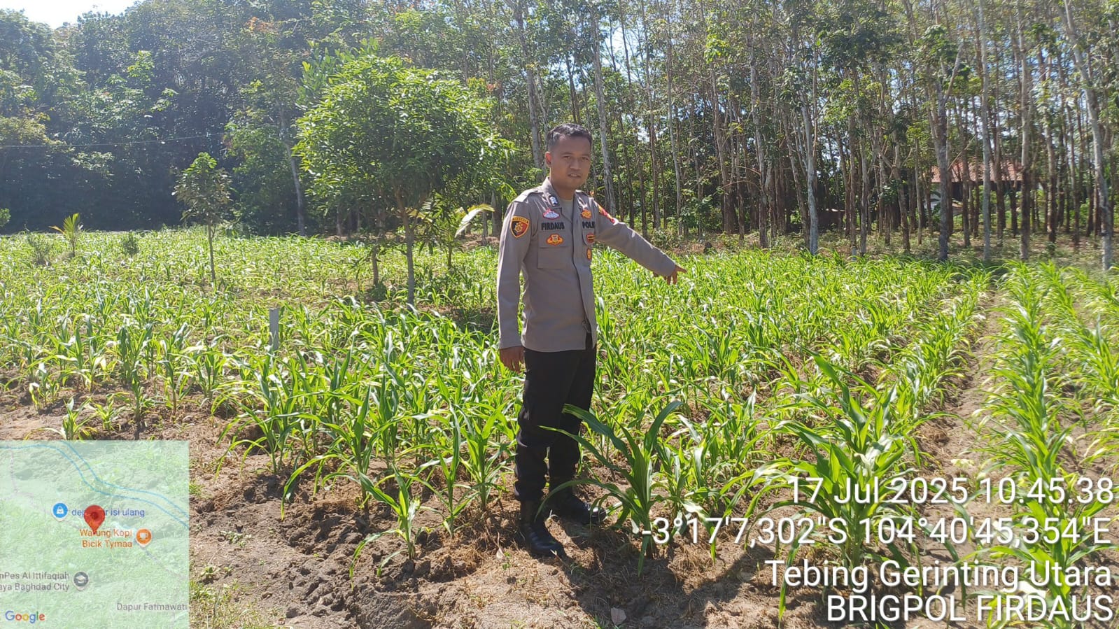 Kegiatan ini merupakan bagian dari langkah proaktif Polri, khususnya melalui fungsi Bhabinkamtibmas, dalam mendorong kemandirian pangan masyarakat di wilayah desa binaan. Kali ini, Brigpol  Firdaus melakukan pengecekan terhadap lahan jagung seluas kurang lebih 1 hektar, milik warga atas nama warga. Jagung yang ditanam di lahan tersebut.