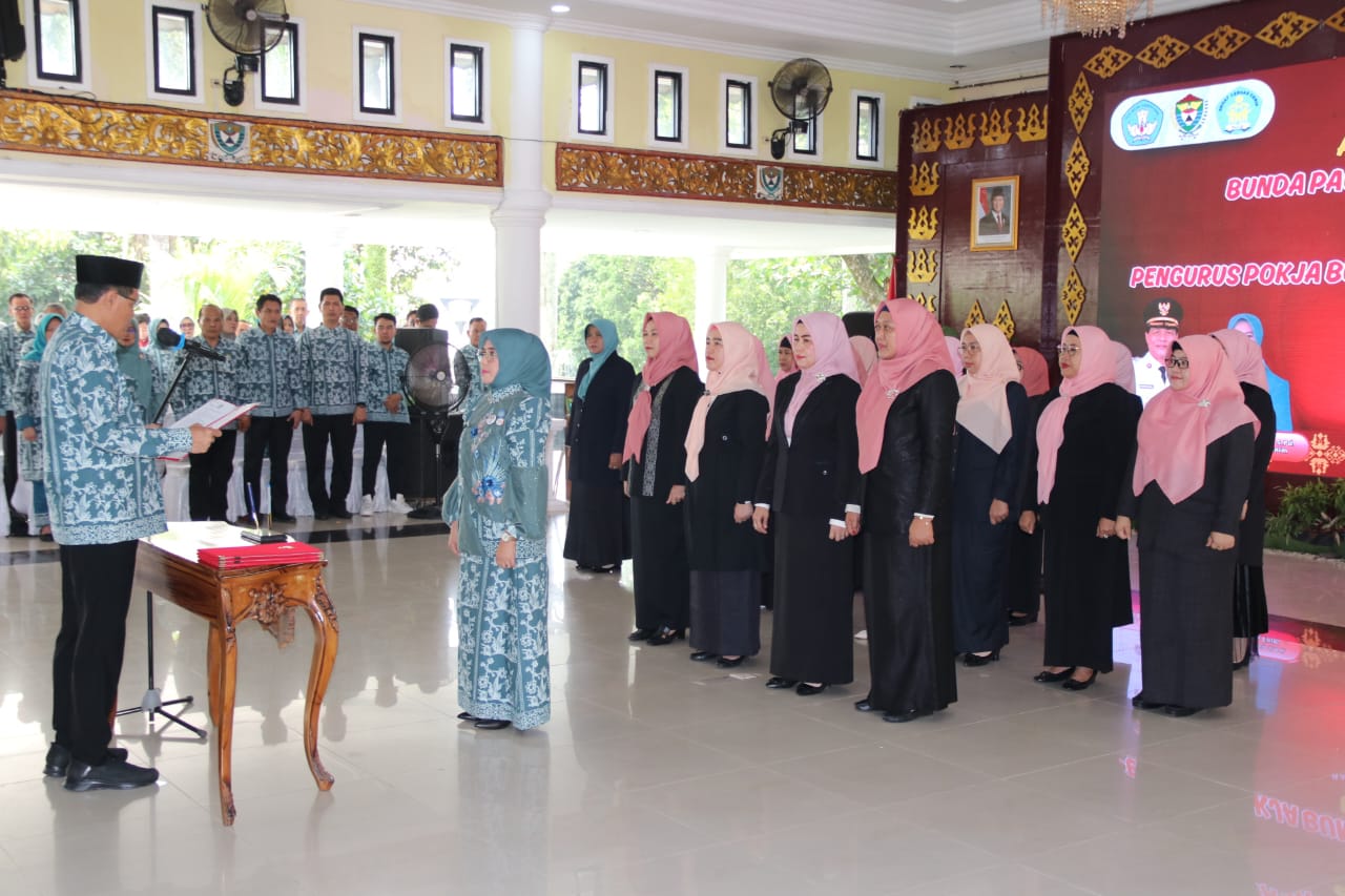 Muara Enim — Bupati Muara Enim, H. Edison, S.H., M.Hum., secara resmi mengukuhkan, Hj. Heni Pertiwi Edison, S.Pd., sebagai Bunda Pendidikan Anak Usia Dini (PAUD) Periode 2025-2030 yang digelar di Balai Agung Serasan Sekundang (BASS), Jumat (05/07). Pada pengukuhan yang dihadiri sejumlah kepala OPD dan Camat tersebut, juga dilaksanakan pelantikan pengurus Pokja dan Bunda PAUD Kecamatan, Tim Pembina Posyandu Kecamatan serta pengurus Dewan Kerajinan Nasional Daerah (Dekranasda) Kabupaten Muara Enim.