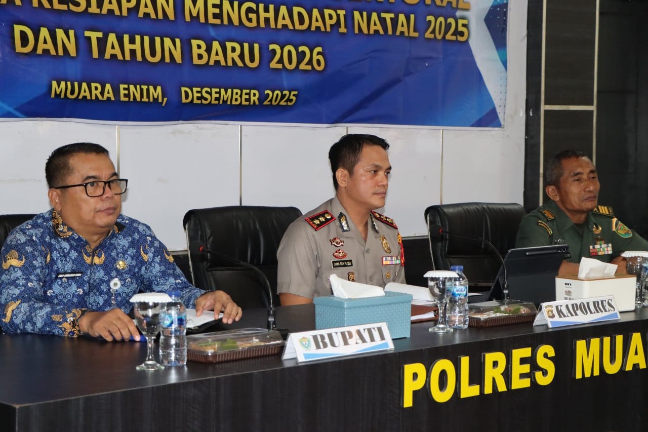 Muara Enim — Dalam rangka memastikan kesiapan pengamanan Natal 25 Desember 2025 dan Tahun Baru 1 Januari 2026 (Nataru), Polres Muara Enim Polda Sumsel menggelar Rapat Koordinasi Lintas Sektoral bersama seluruh pemangku kepentingan, bertempat di Ruang Rupatama Polres Muara Enim, Selasa (17/12/25).