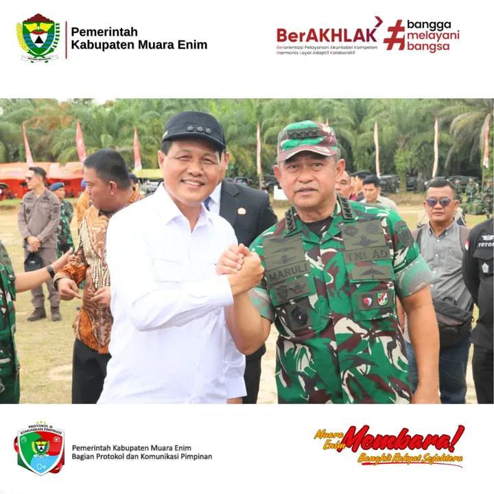 MUARA ENIM – Kegiatan TNI Manunggal Membangun Desa (TMMD) Ke-126 di Kabupaten Muara Enim yang menyasar pembangunan di tiga desa, yakni Desa Saka Jaya, Desa Muara Harapan, dan Desa Harapan Jaya, Kecamatan Muara Enim secara resmi ditutup oleh Kepala Staf Angkatan Darat (KSAD) TNI AD, Jenderal Maruli Simanjuntak. Penutupan berlangsung di Desa Muara Harapan, Kecamatan Muara Enim, dan dihadiri langsung oleh Bupati Muara Enim, H. Edison, S.H., M.Hum didampingi jajaran Forkopimda Kabupaten Muara Enim, Kamis (6/11/2025). Dalam sambutannya, Jenderal Maruli menyampaikan bahwa TMMD merupakan wujud nyata pengabdian TNI kepada masyarakat, khususnya di wilayah pedesaan.