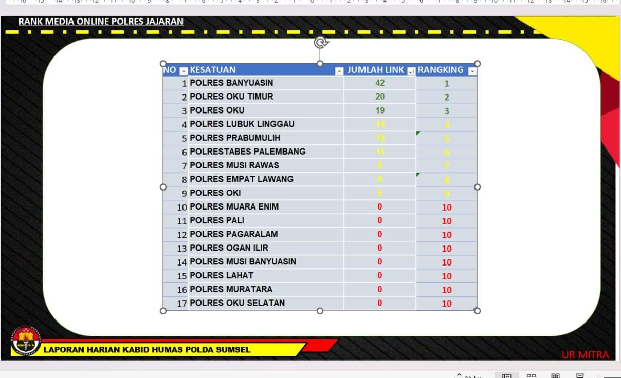 Berdasarkan rekap Humas Polda Sumsel link berita media online yang disebarkan oleh Kasubag Humas Polres Banyuasin AKP Soetedjo, dimana polres Banyuasin meraih peringkat pertama dengan pencapaian 42 link berita media online